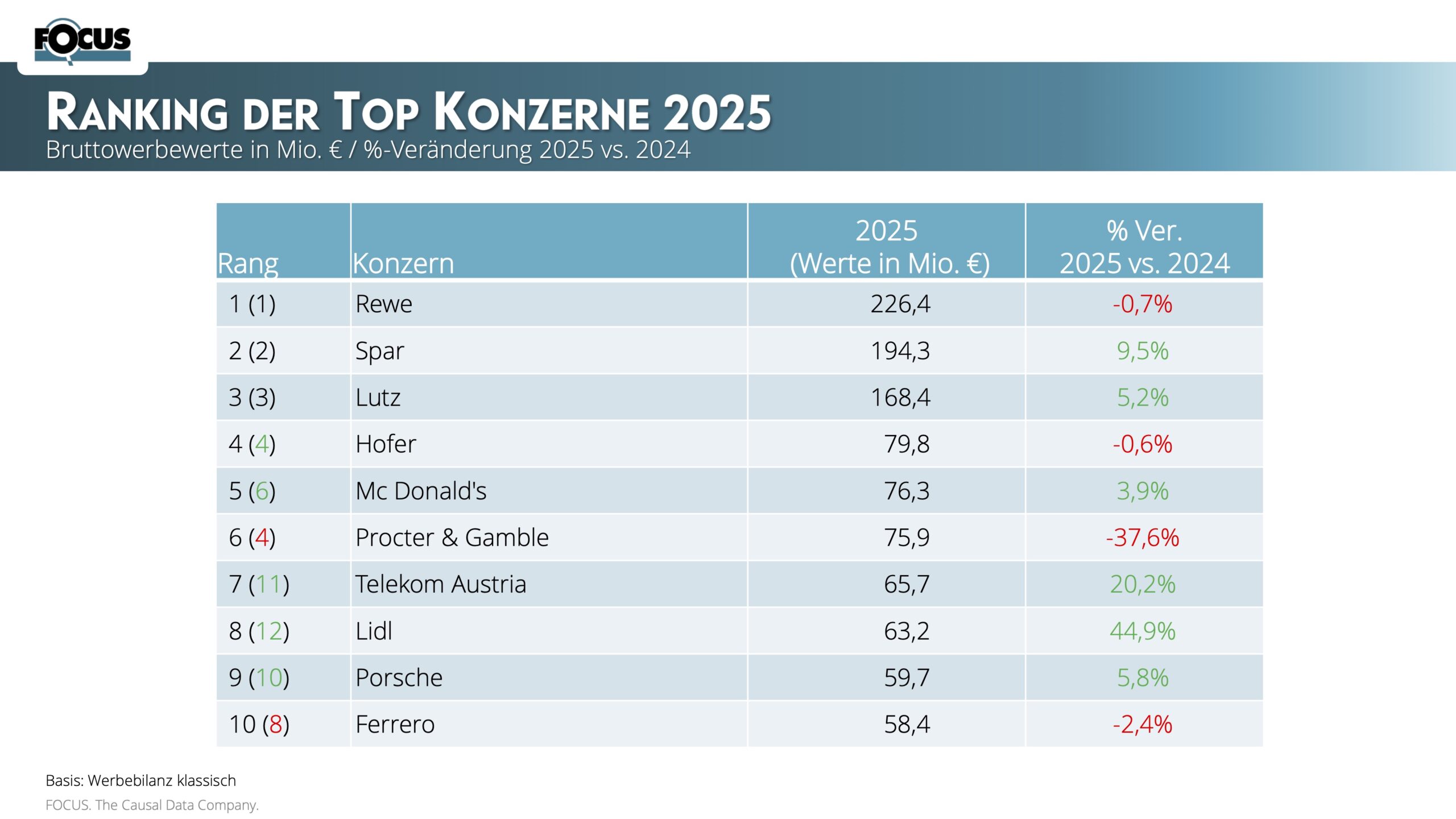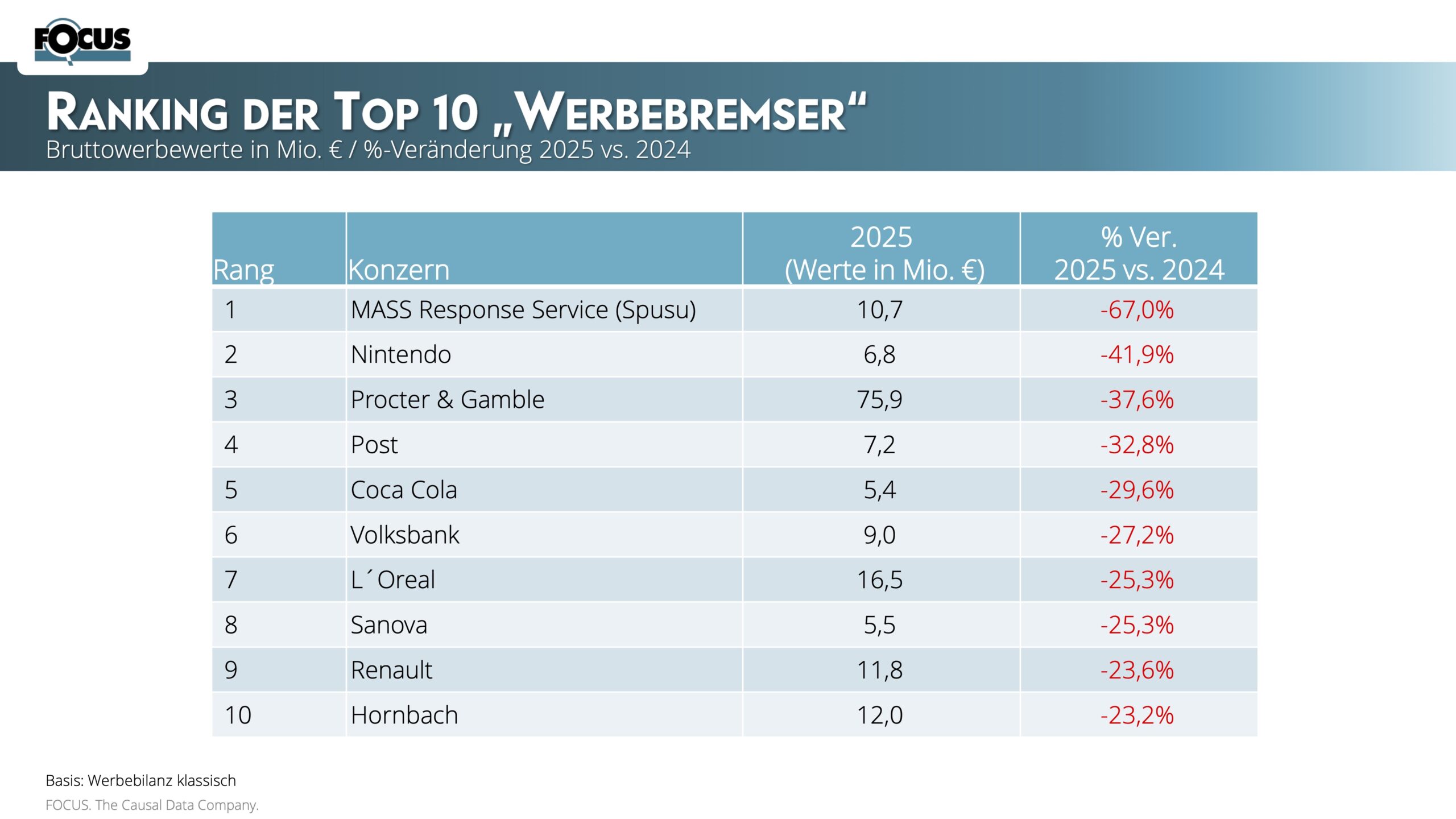 Eine Studie von Focus Research zeigt, welche Unternehmen 2025 am meisten in Werbung investiert haben.