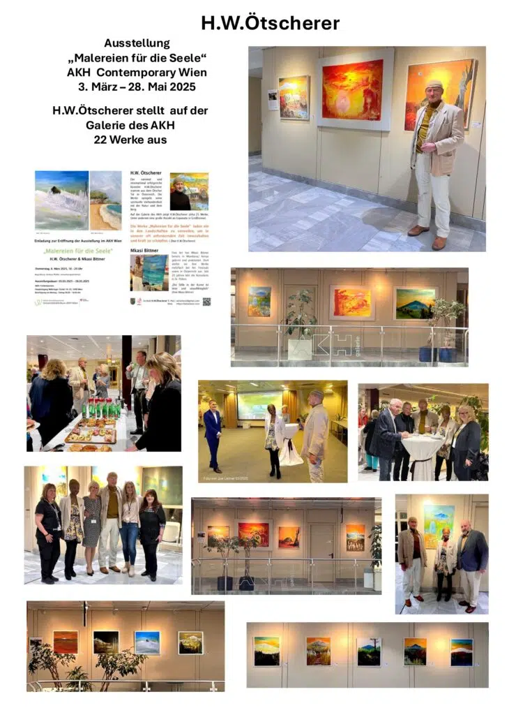 H. W. Ötscherer kam, holte Micky Maus Hefte in der MG MedienGruppe ab, und ließ einen Blick auf seine Kunst zurück. Der mit Acryl und Öl arbeitende Maler ist eine interessante Persönlichkeit. Firmiert er doch unter dem Namen H. W. Ötscherer. Und zwar deshalb, weil er vor dem Ötscher im Vorderötscher, Niederösterreich das Licht der Welt erblickte. In Wahrheit heißt der Mann Herbert Wallmann. Seine Kunstwerke sind noch wenige Wochen im AKH Contemporary Wien ausgestellt. Wer seine 30, teils großformatigen, Werke besichtigen will, der sollte – einmal ohne Erkrankung – gerne im AKH vorbeischauen…