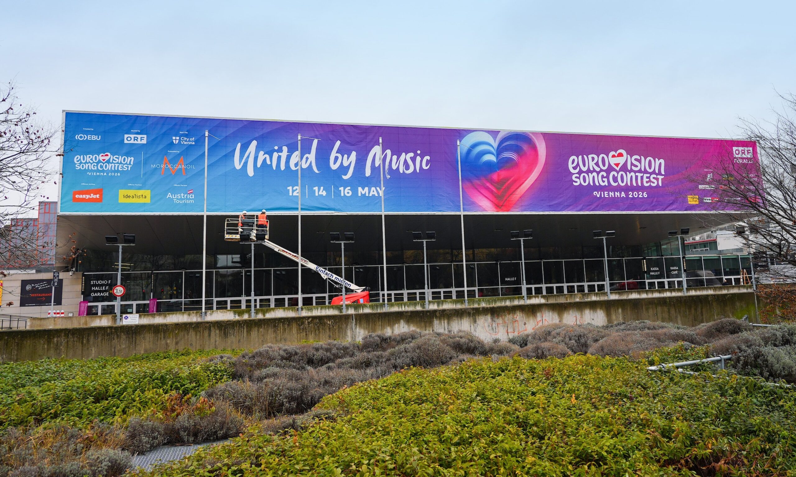 Die Wiener Stadthalle präsentiert sich ab sofort im Design des Eurovision Song Contest. Auf das Vordach der Halle F wurde ein großflächiges Plakat im offiziellen ESC-Design aufgetragen. Damit ist Europas größter Musikevent nun auch optisch in der Stadthalle angekommen.